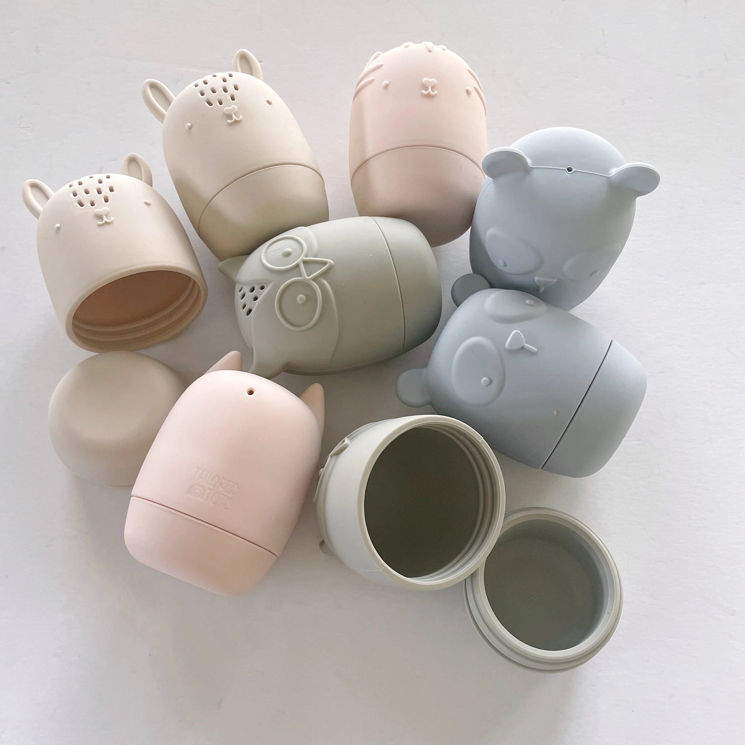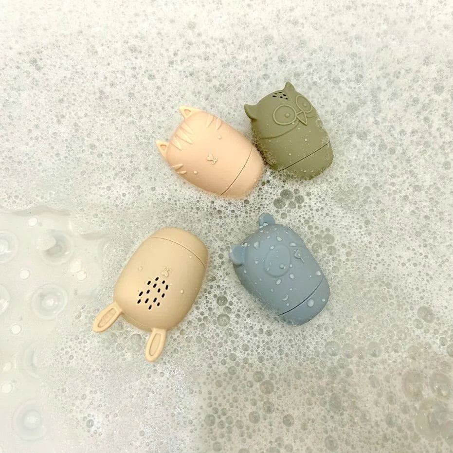 Tailored Tots 4 pack silicone bath toys are a fun and interactive. Each toy features one to several spout holes for water squirting fun and all can open to be cleaned so you never have to deal with the mildew buildup that traditional bath toys accumulate over time.